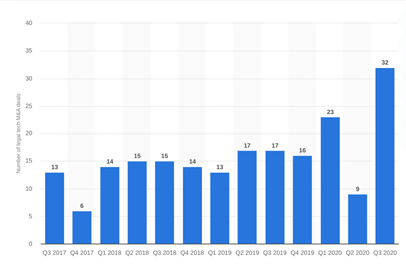 Legal tech M&A deals are also heating up with Q3 figures already overtaking last year’s performance, including 32 deals in the third quarter of 2020, the highest recorded thus far.