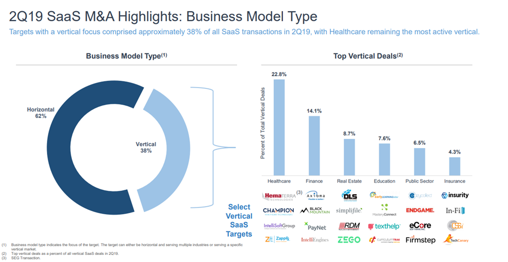 A similar Q2 2019 analysis from the Software Equity Group found that vertical-focused companies comprised approximately 38% of all SaaS M&A transactions with healthcare leading the pack followed by finance and real estate.