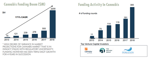 Funding has also grown at a CAGR of 171%, from $15 million in 2013 to $2.2 billion in 2018, and is only expected to explode going forward, driven by a new class of cannabis-specific investors such as Poseidon Asset Management, The Arcview Group, and Canopy Boulder.